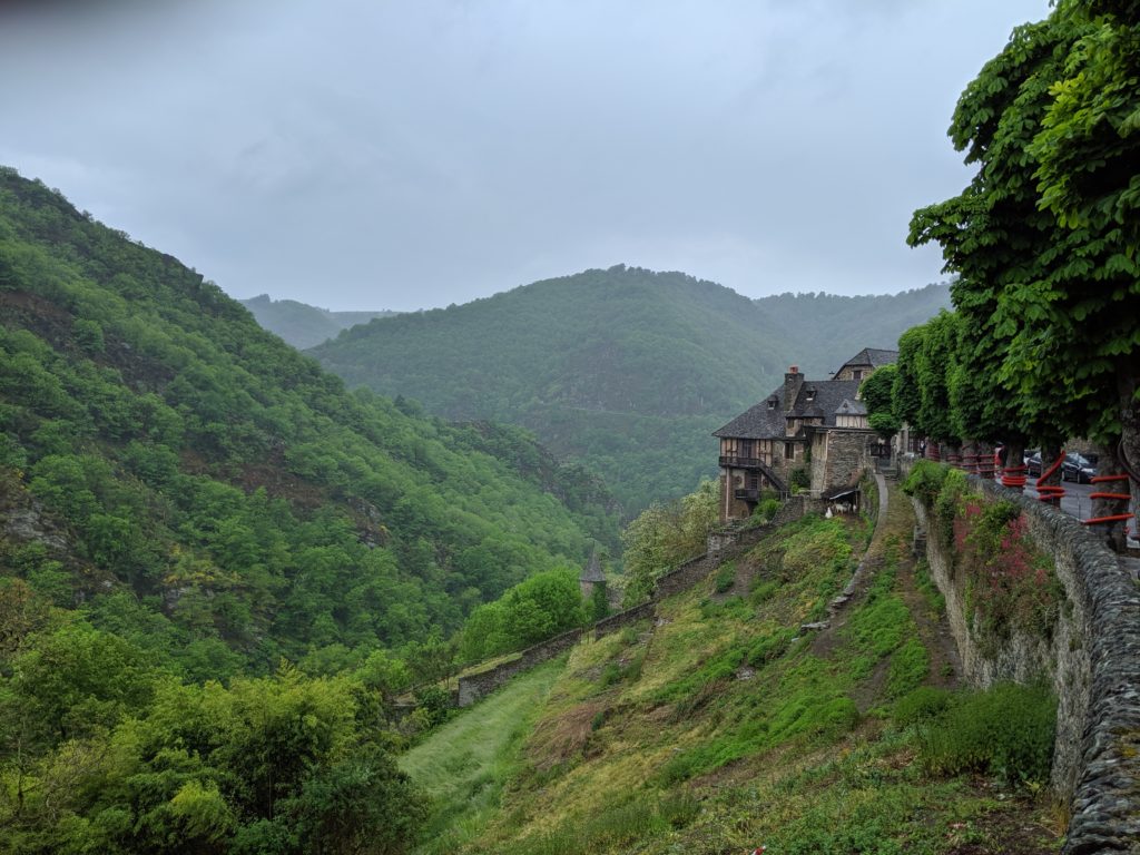 Au petit-déjeuner la pluie est bien présente elle martèle la verrière. Décision est prise d’attendre une potentielle accalmie promise pour l’après-midi. En attendant : un peu de Tourisme. Direction Conques, et sa petite cité médiévale accrochée au flanc d’une colline abrupte. Le cortège de voitures, un peu moins étoffé que la veille, s’élance le long du Lot. Conques en Rouergue, pour ceux qui s’interrogent sur quel Conques nous sommes allés visiter, est perché en haut d’une côte bien raide, mais apparemment nos cyclistes ont l’air plus à l’aise avec la pédale d’accélérateur que les pédales de leurs bicyclettes.