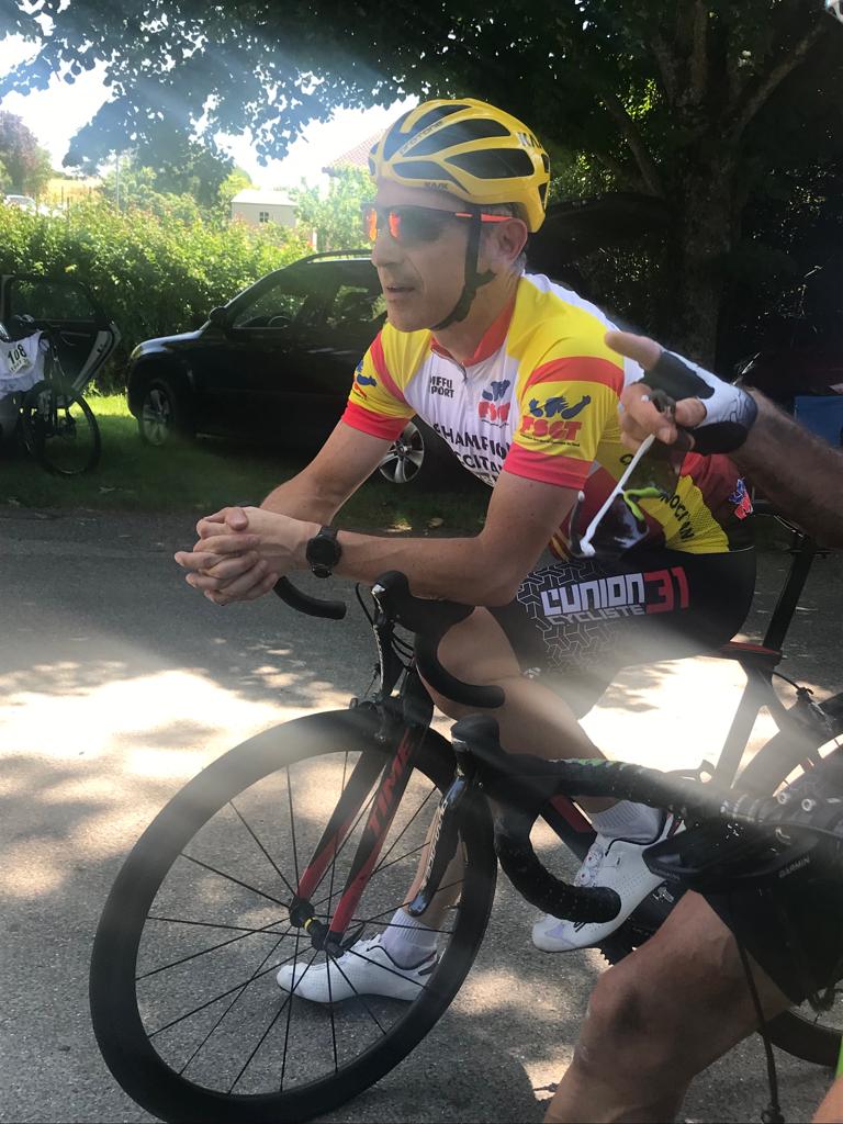 Le week-end du 1er et 2 juillet, la commune de Saint-Georges-sur-Erve (Mayenne) a été le théâtre du championnat national FSGT auquel a participé une sélection de la Haute-Garonne. Parmi les sélectionnés se trouvait un représentant de l’UC31, Frédéric, dans la catégorie Super Vétérans (coureurs de 50 à 59 ans). Il était accompagné de 5 autres haut-garonnais dans sa catégorie : Jean-Luc Bonnet (Balma VS), Xavier Penot (Balma VS), Jérôme Sartori (CPRS), Daniel Devèze (CPRS) et David Lambert (VC Roquettes).